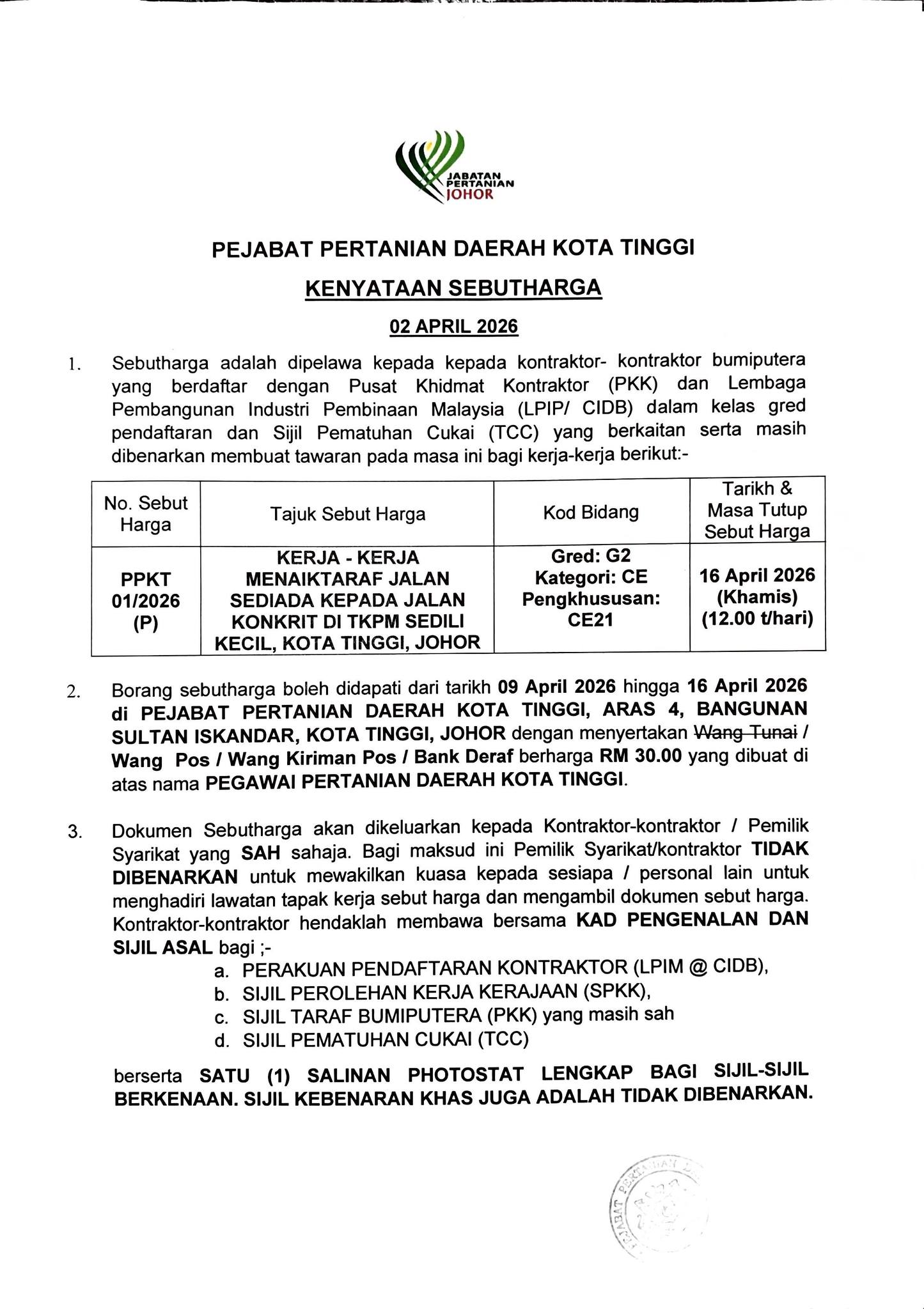 𝐏𝐄𝐉𝐀𝐁𝐀𝐓 𝐏𝐄𝐑𝐓𝐀𝐍𝐈𝐀𝐍 𝐃𝐀𝐄𝐑𝐀𝐇 𝐊𝐎𝐓𝐀 𝐓𝐈𝐍𝐆𝐆𝐈 . . . 𝗞𝗘𝗡𝗬𝗔𝗧𝗔𝗔𝗡 𝗦𝗘𝗕𝗨𝗧𝗛𝗔𝗥𝗚𝗔 . . Pejabat Pertanian Daerah Kota Tinggi mempelawa kontraktor yang…