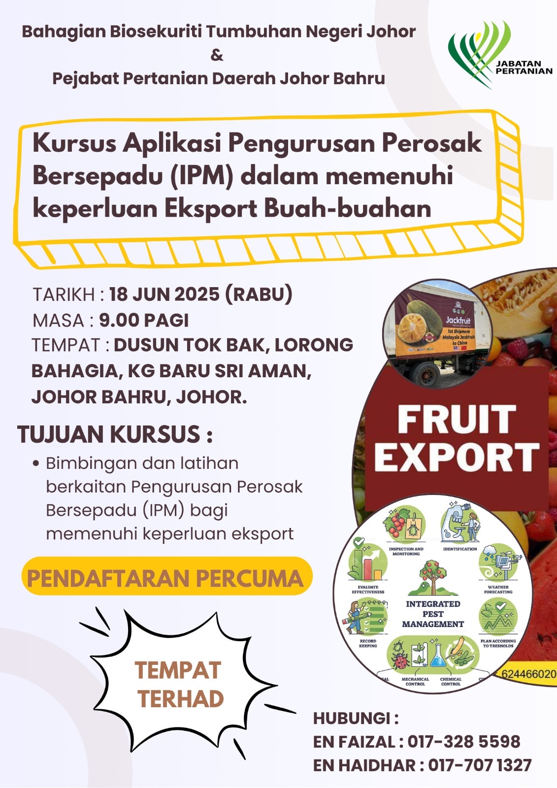 Jom ikuti Kursus Aplikasi Pengurusan Perosak Bersepadu ( IPM ) Dalam Memenuhi Keperluan Eksport Buah-buahan.