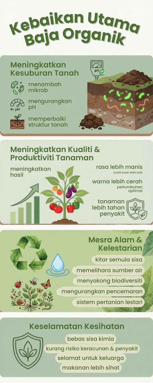 Sistem perladangan organik yang mengguna pakai baja organik memberi manfaat kepada alam sekitar: